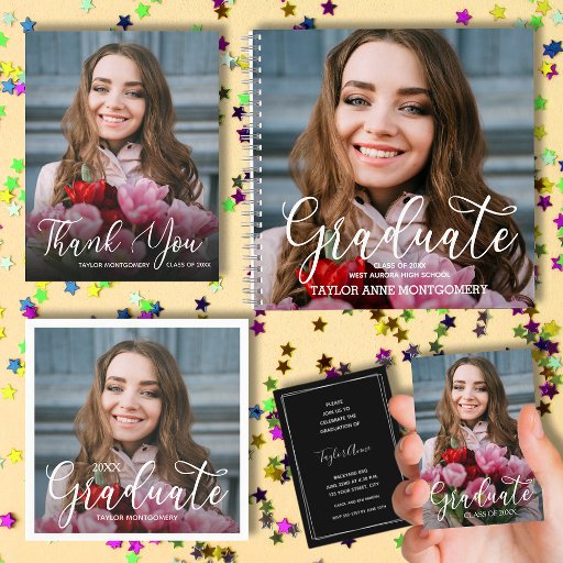Cartões GLOSSY vendidos como PACOTE DE 100. SEM ENVELOPES - 3,5" x 2,5"** Tamanho perfeito para o seu formando entregar aos amigos e à família para uma celebração de festa de formatura. Sua foto na frente e no Formando em um script branco-chic e suas informações sobre a festa no fundo QUALQUER COR que se adequa à sua foto. **5 X 7 TAMANHO DISPONÍVEL EM NOSSA LOJA. Veja mais estilos, tamanhos, cartões salve a data, anúncios e muito mais em nossa loja.