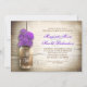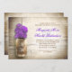 lindos antecedentes de madeiras rústicas e jarro de mason com flores roxas ensaiando convites para janto. Eu sugiro linho ou papel de feltro para este design.
