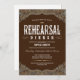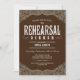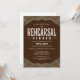 Estes convites para um janto de ensaio de casamento são marrons escuros com um design branco, bege e azul claro.
