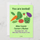 Apresentando legumes animados atraídos por vetores, incluindo cenoura, ervilhas, rabanete, pimenta, berinjela e tomate, este convite constituiria uma forma excelente de promover uma banca de produtos, o mercado do agricultor, a feira de condados ou outros eventos agrícolas.