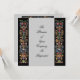 Arte vítrea de um manuscrito iluminado antigo com flores coloridas e folhas de rolagem em preto e cinza.