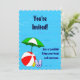Convites de festas personalizados com um tema de piscina de natação divertida, decorados com uma bola vermelha de praia, guarda-chuva verde, sandálias e óleo de bronzeado em um fundo azul-d'água com ondas encaracoladas. Clique em Personalizar para alterar fontes ou cores.