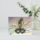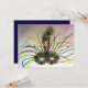 Pintura em aquarela com leves toques de pastel de uma máscara de Mardi Gras emplumada. Utiliza as cores tradicionais do Mardi Gras: roxo, verde e dourado. Duas penas de pavão coroam a máscara. A frente do cartão de convite observa "Mardi Gras". O verso dos cartões de convite tem "Laissez les bon temps rouler!" como uma saudação e espaço para você adicionar os detalhes personalizados do convite de sua festa de carnaval. Todas as palavras no cartão podem ser personalizadas, conforme necessário.