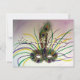 Pintura em aquarela com leves toques de pastel de uma máscara de Mardi Gras emplumada. Utiliza as cores tradicionais do Mardi Gras: roxo, verde e dourado. Duas penas de pavão coroam a máscara. A frente do cartão de convite observa "Mardi Gras". O verso do cartão de convite tem "Laissez les bon temps rouler!" como uma saudação e espaço para você adicionar os detalhes personalizados do convite de sua festa de carnaval. Todas as palavras no cartão podem ser personalizadas, conforme necessário.