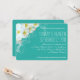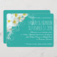 Convites de casamento para plumeria havaiana. Cor azul-esverdeada da lagoa com flores brancas. Um folheto floresce e flores grandes decoram o canto superior do papel de carta horizontal com texto branco e personalizado. A linha de cima diz: "Encontrei a que o meu coração ama.