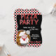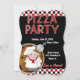 Pizza Party Custom Invices - Um chef gordo (Chef Italiano) fica no canto inferior esquerdo. pizza de Pepperoni e o cortador de pizza também embelezam o cartão. O plano de fundo do convite é um padrão de verificações de fundo em vermelho, branco e preto. O fundo central é preto sólido. O texto vermelho decorativo diz: PIZZA PARTITY. Várias áreas de texto estão em vigor para você personalizar seus convites. Edite o dia, a hora e o local. Essas áreas de texto são brancas. Na parte inferior está uma área de texto de duas camadas (vermelha em branco). O texto diz: "Venham lá!" Exclua as áreas de texto que você não deseja. A parte de trás do convite tem o mesmo padrão de verificação.