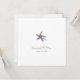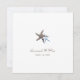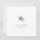 Convites de casamento na praia para casal de estrelas-do-mar. Cartões quadrados com duas estrelas-do-mar na frente com os nomes do casal e data do casamento. Todo o texto do convite está no verso, em modelos fáceis de usar. O fundo é coberto de estrelas-do-mar brancas por trás do texto que é marrom. Atualize o papel como desejar.
