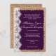Estes convites rústicos do casamento do país caracterizam uma serapilheira e um design impresso laço com um profundo - fundo roxo. Estes são grandes para todo o país ou casamento denominado rústico. Apenas adicione seu próprio convite do casamento que exprime a este modelo. Estes são grandes para qualquer um com as cores roxas do casamento que procuram um estilo do convite do casamento vintage.