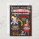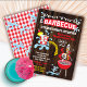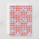 Convites rústicos de piscina e churrasco em madeira. Características incluem uma churrasqueira vermelha, bebida frutada e respingos de água, O verso tem um padrão xadrez vermelho e mais respingos de água. Ótimo para festa de aniversário de verão, noivado ou formatura de adultos.