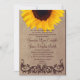 O fundo é um impressão afligido do papel do vintage com um olhar leve textured. Tem um impressão floral ornamentado do rolo da videira na parte inferior do convite. A parte superior do convite caracteriza um grande girassol amarelo brilhante com as pétalas amarelas bonitas da flor. Estes convites rústicos do casamento do girassol são perfeitos para casamentos do país, casamentos do celeiro, casamentos da fazenda, casamentos do vaqueiro, casamentos rústicos, e qualquer um que está usando girassóis em sua buquê do casamento ou decoração da recepção de casamento.