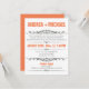 Convites modernos projetados para casamentos em que o casal tem um casamento em destino ou uma cerimônia de casamento privada pequena, e convida os convidados apenas para a celebração da Recepção. A tipografia na frente desses convites é projetada em fontes laranja e cinza, e o verso é um laranja sólido com texto branco opcional para informações de RSVP potenciais.