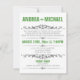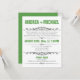 Convites modernos projetados para casamentos em que o casal tem um casamento de destino ou uma pequena cerimônia de casamento privada, e convida os convidados apenas para a celebração da Recepção. A tipografia na frente destes convites é projetada em fontes verdes e cinzas, e o verso é um verde sólido com texto branco opcional para informações de RSVP potenciais.