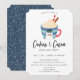 Bonita ilustração do boneco de neve de Natal, caneca quente de cacau de inverno, convite para festas de férias. Texto modelo do estilo design da tipografia de tendência com suporte a padrões azuis e brancos.