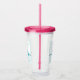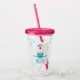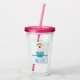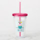 Tumbler acrílico personalizado com um padrão listrado azul claro e branco emparelhado com um padrão de bolinhas azul e rosa. Camadas sobre o topo é um cupcake azul giro com glacé rosa e um rosto sorridente kawaii. Uma cereja em cima também tem um rosto feliz fofo. Uma estrela cadente está voando no ar