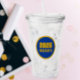 Tumbler moderno, acrílico, com palha de tampa e bebendo para o segundo grau ou formando universitário, com cores reais, azul e ouro, com letras negrito impressas em ouro num círculo azul real com borda dourada.