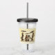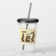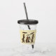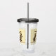 Esta bebida acrílica que cai com palha e tampa tem dois gatos marrons andando com dois gatinhos todos segurando guarda-chuvas na neve caindo sobre um fundo amarelo.
