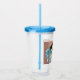 Acrylic Tumbler apresentando um gatinho calico fofo. O gatinho veste uma fita azul enquanto se senta adoravelmente em uma mesa. Um presente perfeito para amantes de gatos e entusiastas de arte vitorianos!