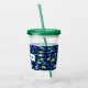 Os miúdos do dinossauro da aguarela personalizaram o Tumbler do acrílico do teste padrão de Dino. Adicione o nome na parte dianteira na pia batismal azul. Edite para mudar a cor ou o estilo da pia batismal. Teste padrão do envoltório dos dinossauros em torno do copo no fundo azul. www.SamAnnDesigns.com