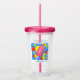 Tumbler acrílico desenhado com um tema de verão. Projetado com picolé cor-de-rosa e alguns morangos vermelhos caindo ao redor do picolé juntamente com alguns plasmas de tinta amarela. Fundo azul. Texto diz "Olá Summer" e seu nome.