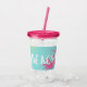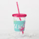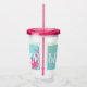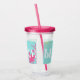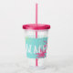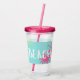 Tumbler branco e rosa com gráfico de praia. Fundo lacrimogêneo com o sol e palmeiras cor-de-rosa com Praia em texto branco. Programas gráficos na frente e atrás do batedor. Variedade de cores a escolher para a tampa e palha.