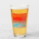 Um design abstrato de um pôr do sol oceânico com cores ousadas em vermelho, laranja, ciano, azul e bege.