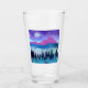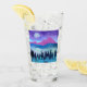 Uma paisagem de abstrato com cores e texturas únicas mostrando uma cena de montanha com árvores e neblina névoa em tons de roxo, azul, lacre e ciano.