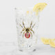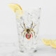Aranha mecânica, com pá-pá de ouro, engrenagens de latão e uma lâmpada de vidro vermelha sobre fundo preto. Estilo Steampunk.