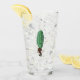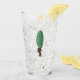 Este tumbler de vidro para bebidas tem um homem engraçado em um terno marrom com um grande picle verde para uma cabeça com um rosto surpreso na frente e atrás.