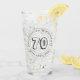 Vidro comemorativo de comemoração de aniversário com o nome da pessoa e a data do seu aniversário. Um copo para alguém com 70 anos. Estilo do número da estrutura de tópicos.
