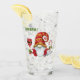 Este batedor de vidro Holiday tem uma imagem de um elfo gnomo bonitinho vestido com um chapéu de Papai Noel vermelho e dourado. Ele segura um copo de vinho do Papai Noel em uma mão, e uma cana de doce listrada vermelha e branca na outra. No canto superior esquerdo da imagem está o texto em verde que diz "Saúde!". A imagem e o texto são impressos em dois lados do vidro.
