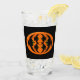 Este esplêndido tumbler de vidro apresenta um oval laranja com seis corvos. Cada corvo tem olhos amarelos com pupilas pretas e asas salientes. Os corvos voam em direção uns aos outros formando uma forma oval. O fundo é preto.