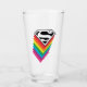 Pride DC| Logotipo icônico do Super-Homem com camadas de cores do arco-íris projetadas atrás dele.