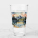 Watercolors of nature landscape of evening approaches and the moon begins to glisten on the lake, there are woods ANF trees with mountains in the background..