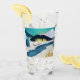 Uma paisagem digital com cores brilhantes e texturas mostrando um cogumelo com uma equipe de trenó de cão e um sol cor-de-rosa brilhante em tons de azul, ouro, ciano e amarelo.