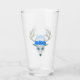 Este tumbler de vidro para bebidas tem uma mística cabeça branca de cervo com grandes galhadas, bonito olhos azuis, vestindo três grandes rosas azuis no topo da cabeça na frente e atrás.
