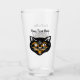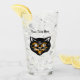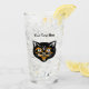 Este tumbler de vidro para bebidas tem uma face sorridente feliz de um rosto de gato preto de Halloween vintage com sotaques laranja e branco na frente e atrás. Personalize seu texto na frente e atrás com os modelos.