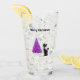This glass tumbler for beverages has a sparkling pink and silver tree on a white star rub next to a pretty black cat wearing a pink bow on the front and back. Customise your text on the front and back with the templates.
