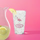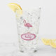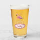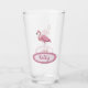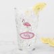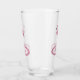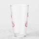 Um flamingo, branco, colorido em xadrez rosa, com o seu nome emoldurado em rosa e xadrez.