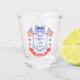 Este copos de shot para chá de noiva patriótico apresenta um brasão em aquarela com um brasão patriótico vermelho branco e azul claro com bandeiras americanas e um laço azul. O texto no centro do brasão diz "Vermelho, branco e eu aceito". Você pode personalizar com a data do seu evento.