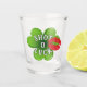 Deixe a Rua. As comemorações de Patrick começam com um brinde e uma bebida deste único e engraçado copo com uma imagem de trevo verde e o texto de "SHOT O' LUCK", coberto com um beijo de lábios vermelhos.