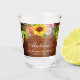 Copo de Shot para Festa de Despedida de Solteira com Girassóis em Aquarela, Rosas, Peônias e Folhagens em Madeira Rústica