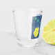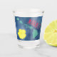 Hawaii State Islands Shot Glass com palavras, ilhas, flor de estado de hibisco amarelo em fundo azul-oceânico pelo artista Jason Girard para alguém que ama o Havaí e designs coloridos.