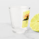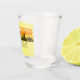 O Shot glass apresenta a silhueta do horizonte da cidade de Los Angeles, na Califórnia, com a abertura da cor d'água e as coordenadas de latitude e longitude em fundo amarelo pálido.