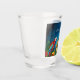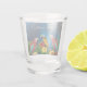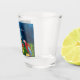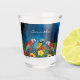 Aves tropicais, papagaios em azul, amarelo e vermelho sentados em folhas verdes de palma. Decorado com flores tropicais. Um céu azul escuro como fundo. Modelo para um nome, script de estilo branco, escrito à mão. Perfeito para festas de verão ou como presente. Use sua chave de espaço traseiro para excluir se você quiser o vidro sem texto ou nome.
