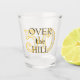 Copo de shot Além da Montanha. Inclua a idade dele ou dela atrás da frase "além da montanha". O texto é marrom-escuro/preto com sombra laranja. Os números são cinza-claro delineados em laranja-amarelo.