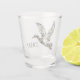This monogrammed shot glass features a flying mallard duck in camouflage print of brown and dark green. Personalize the monogram with your choice of initials. Great for monogrammed gift bags and party favors.