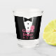 Copo de shot divertido para o noivo. Smoking preto com uma flor rosa na lapela, bebida para personalizar para o noivo com o nome e data do casamento.