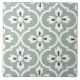 Cor moderna da luz no clássico padrão mediterrânico espanhol, azulejo cerâmico. Um fundo verde muito leve, floral branco com gotas d'água castanhas.