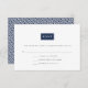 Elegantes, sofisticados e modernos, estes cartões de resposta de casamento ultra modernos apresentam "RSVP" definido em um elemento retangular que pode ser personalizado com o clique de um botão para combinar com as cores do seu casamento. Adicione a data de RSVP desejada, aceitação e declínio, e um campo para o número de acompanhantes em letras sem serifa modernas em cinza carvão, e ajuste a cor de acordo com sua preferência usando as instruções fáceis abaixo. Os cartões têm um reverso com um padrão opcional de chave grega moderna. Mostrado em azul clássico e branco.