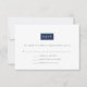 Elegantes, sofisticados e modernos, estes cartões de resposta de casamento ultra modernos apresentam "RSVP" inserido num elemento retangular que pode ser personalizado com um clique para combinar com as cores do seu casamento. Adicione a data de RSVP desejada, textos de aceitação e declínio, e um campo para o número de acompanhantes em letras sem serifa modernas em cinza carvão, e ajuste a cor ao seu gosto usando as instruções fáceis abaixo. O verso dos cartões apresenta um padrão opcional de chave grega moderna. Mostrado em azul clássico e branco.